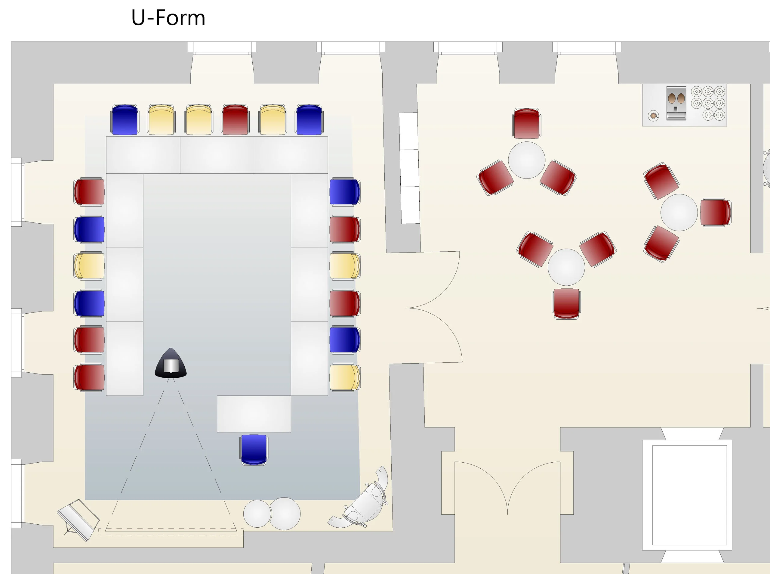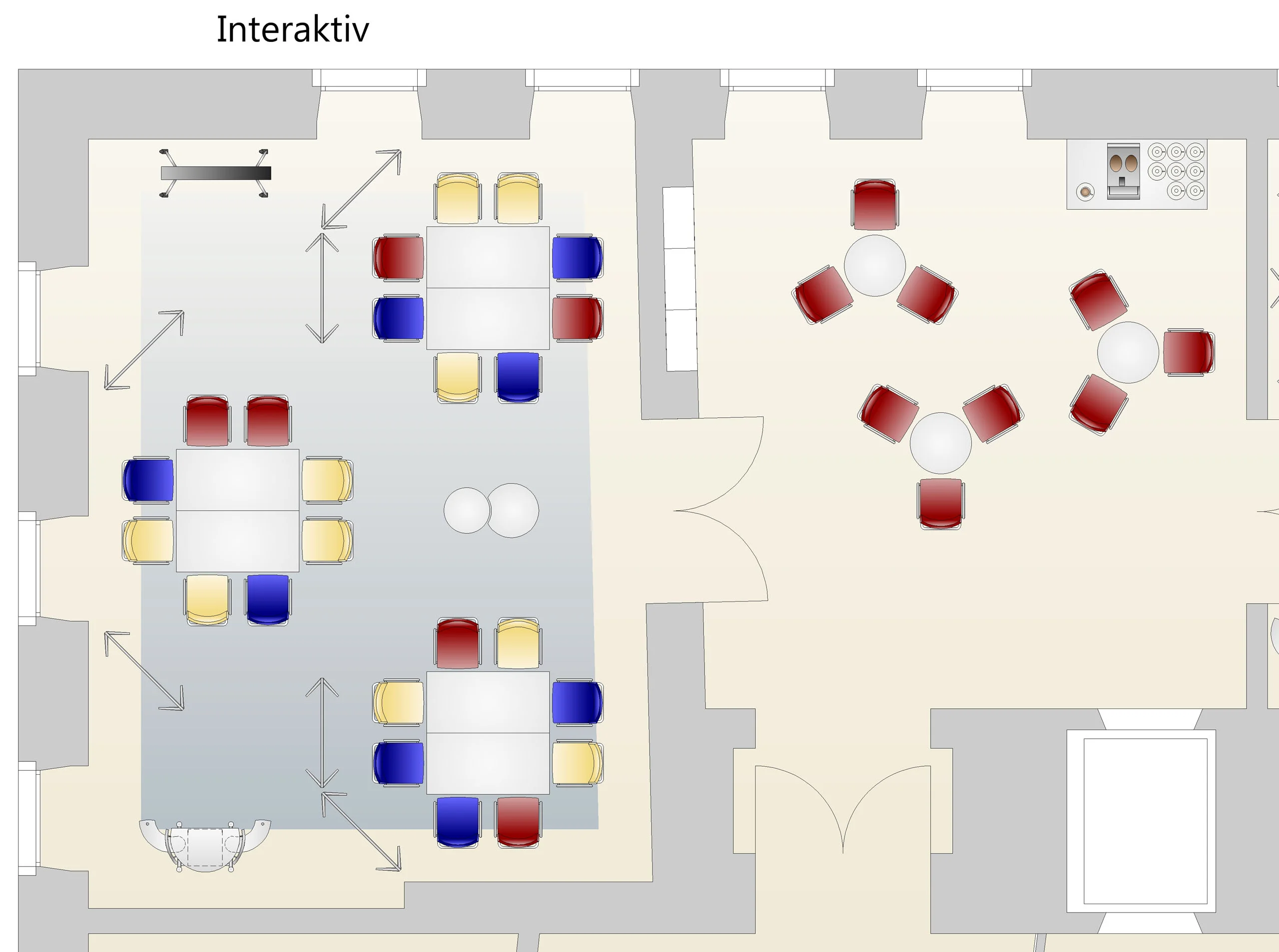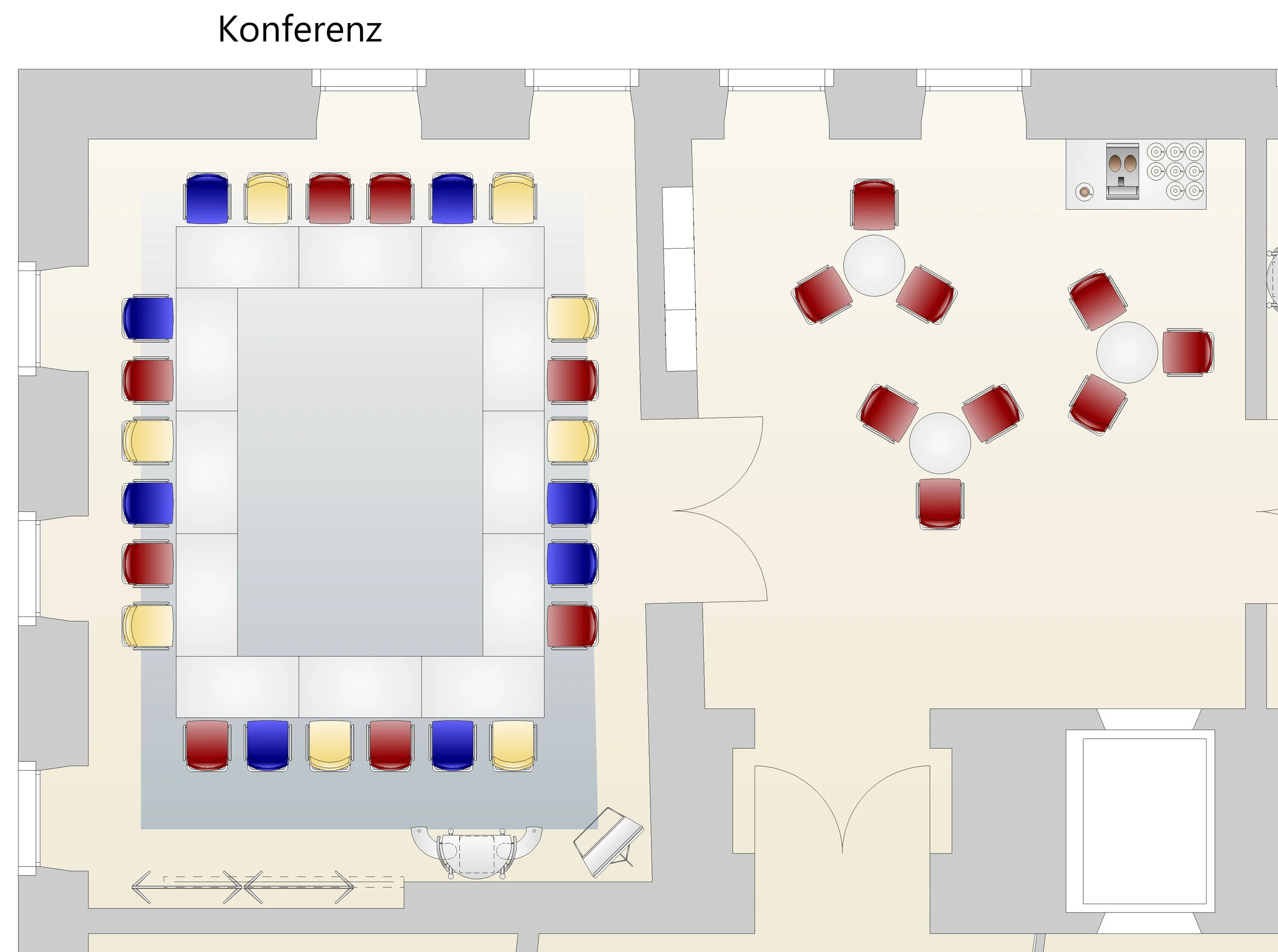 Lichtdurchflutet, großzügig und dennoch familiär – das GeistReich schafft mit seinen 55 m² den perfekten Rahmen für konzentriertes Arbeiten. Der große Tischblock oder die U-Form bietet bis zu 20 Teilnehmern einen komfortablen Arbeitsplatz. Bei Theaterbestuhlung finden 40 Gäste Platz.