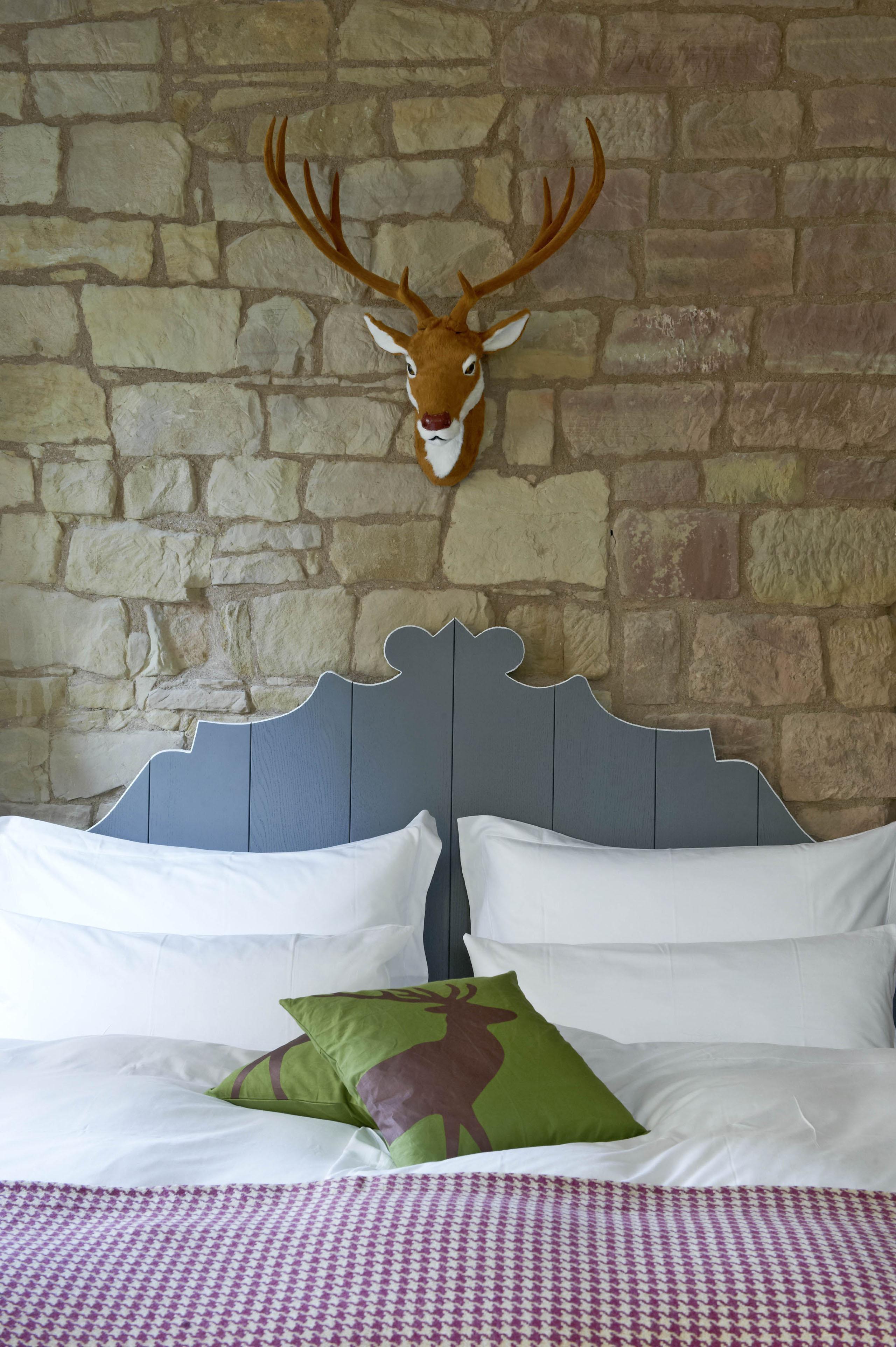 Dunkle Holzvertäfelung, Filz- und Leinenstoffe, erdige Farbtöne. Sie setzen den ersten Schritt in diesen Raum und haben das Gefühl, mitten im Wald zu stehen. Es duftet nach Moos und altem Holz. Und nach grenzenloser Freiheit. Das Jagdzimmer ist ein Ort der Rückbesinnung auf das, was Bestand hat, das sich keiner Mode unterwirft-, das authentisch ist. So wie die Natur.